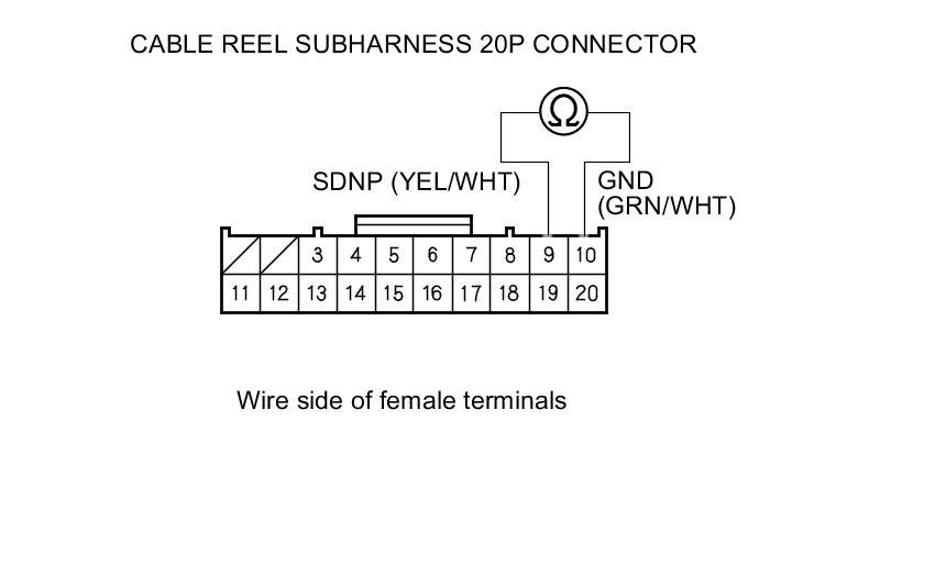 2. Check for continuity between cable reel subharness 20P connector terminals No. 9 and No. 10 when pressing the paddle shifter - (downshift switch) and when the paddle shifter - (downshift switch) is released.