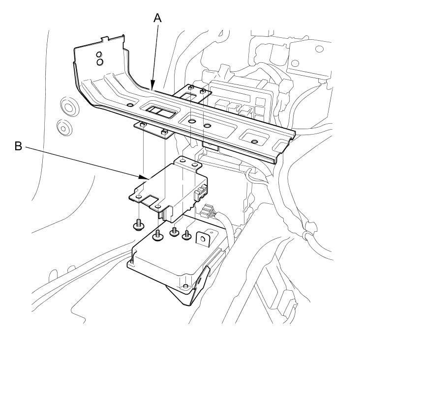 3. Remove the bolts from the rear side trim panel support bracket (A) that holds the BSI control unit (B).
