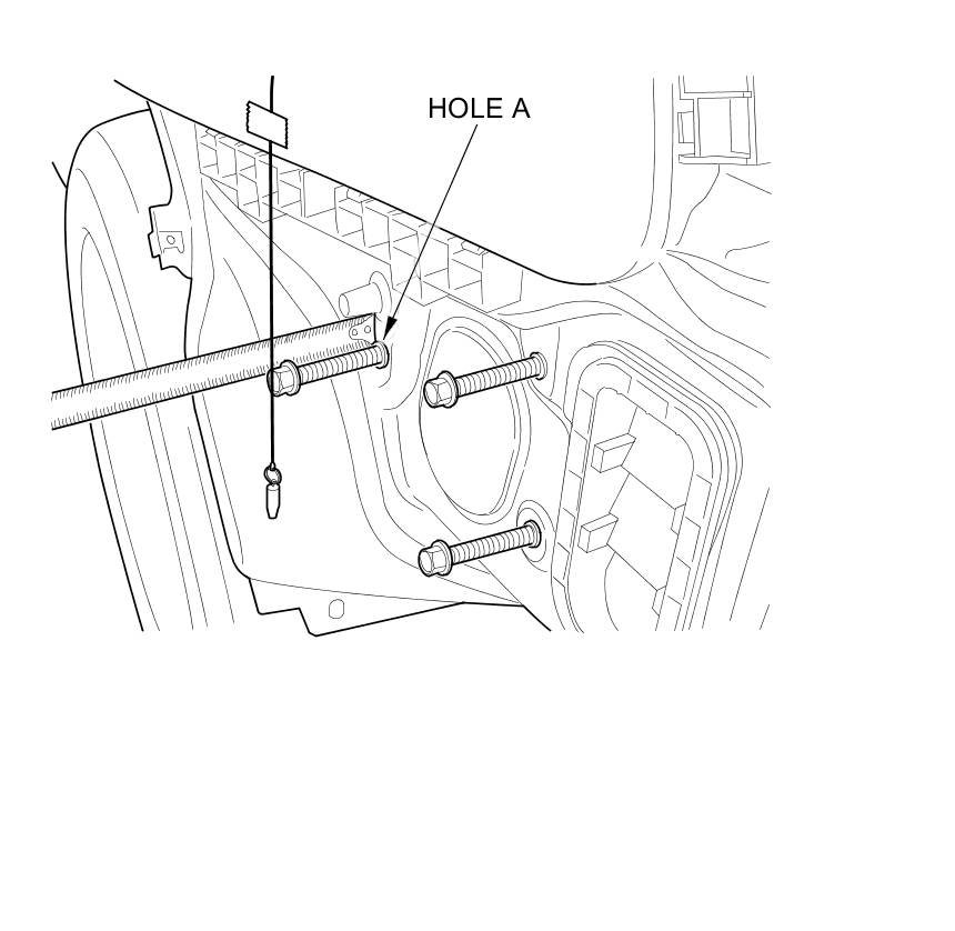 4. Hold or tape the plumb line against the rear quarter panel directly above mounting hole A, and the thread bolt in or out until the head of the bolt just touches the plumb line.