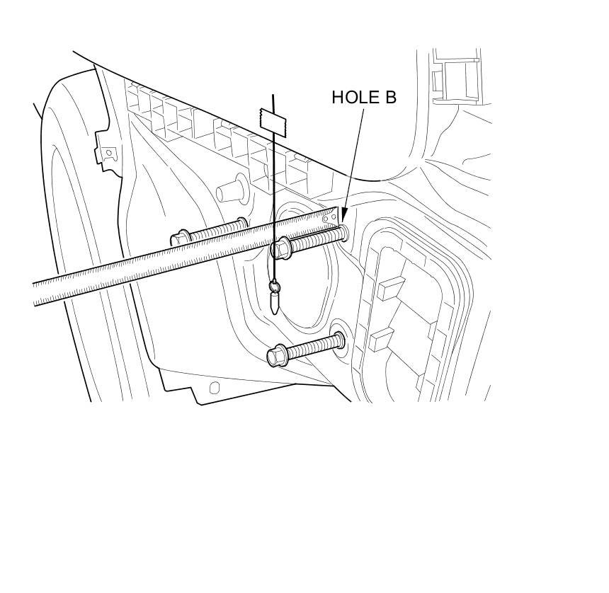 6. Hold or tape the plumb line against the rear quarter panel directly above mounting hole B, and the thread bolt in or out until the head of the bolt just touches the plumb line.