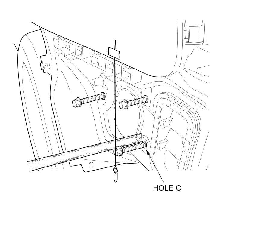 8. Hold or tape the plumb line against the rear quarter panel directly above mounting hole C, and the thread bolt in or out until the head of the bolt just touches the plumb line.