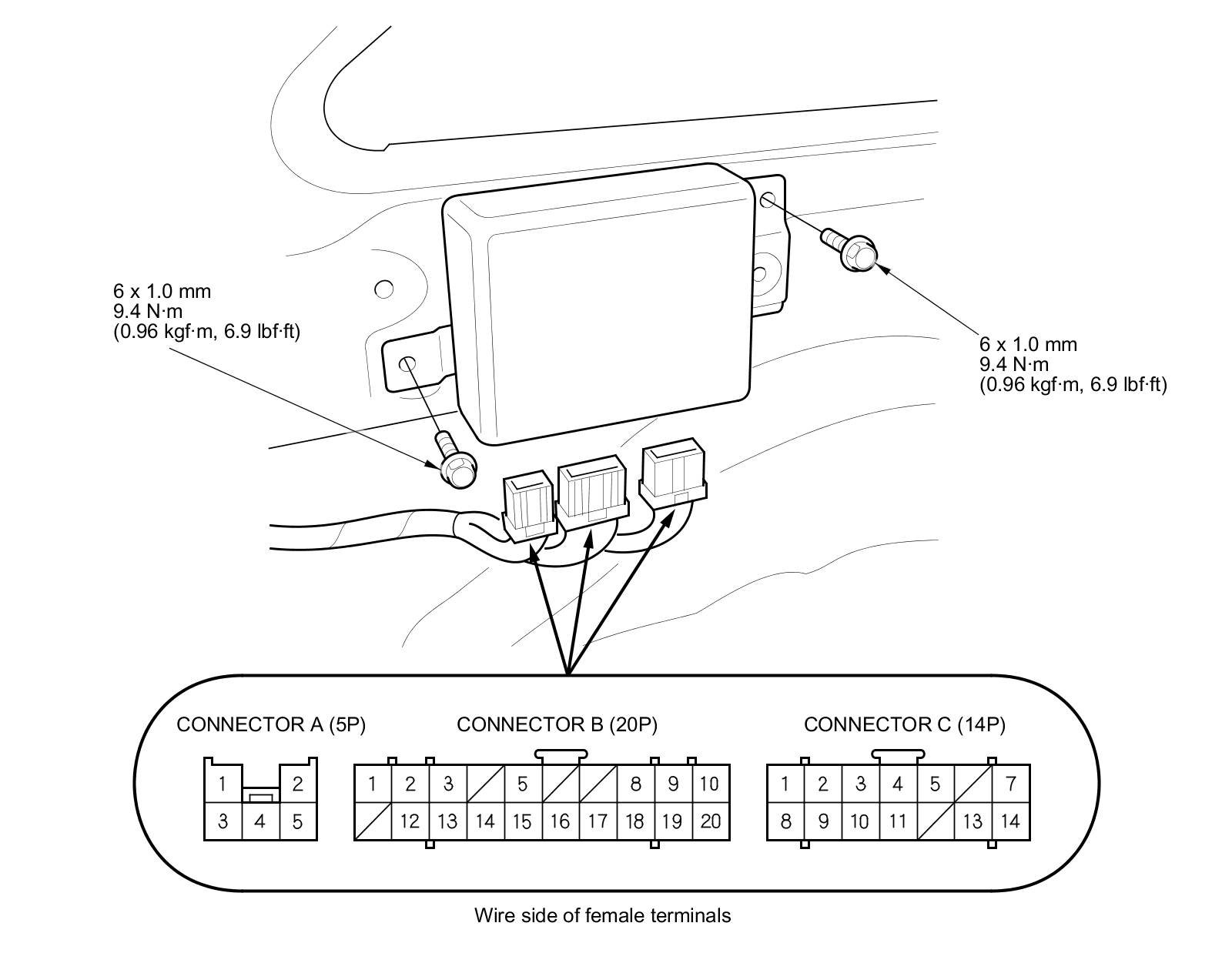 3. Disconnect power tailgate control unit connectors A (5P), B (20P), and C (14P).