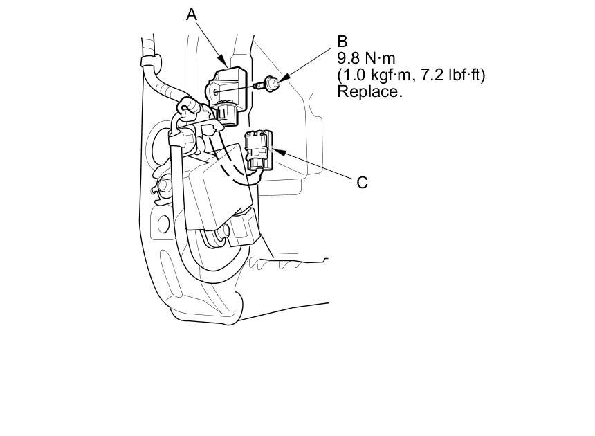 1. Install the front impact sensor (A) with a new TORX bolt (B), then connect the engine compartment wire harness 2P connector (C) to the front impact sensor.