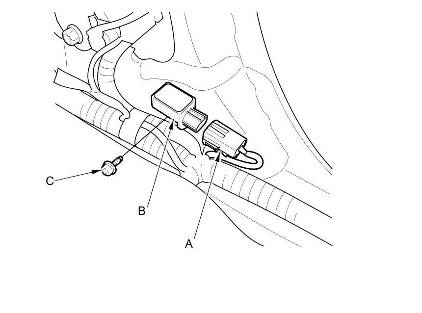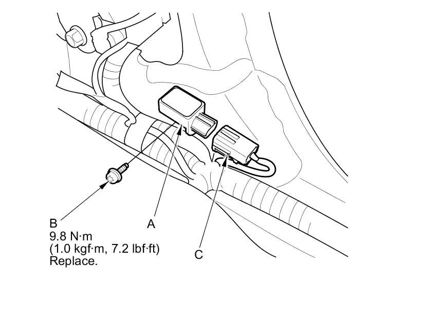 1. Install the side impact sensor (first) (A) with a new TORX bolt (B) using a TORX T30 bit, then connect the floor wire harness 4P connector (C) to the side impact sensor (first).