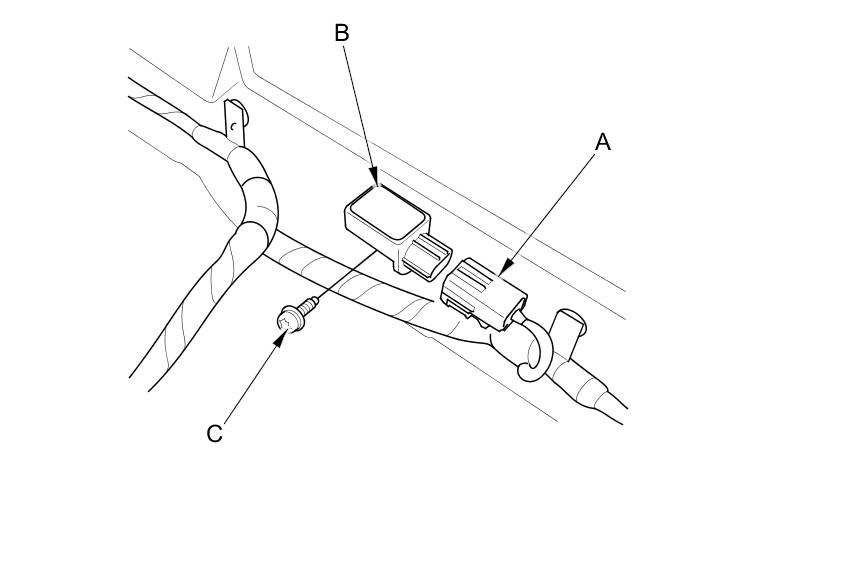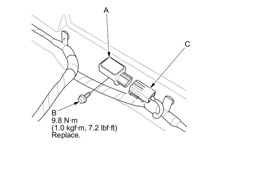 1. Install the rear safing sensor (A) with a new TORX bolt (B) using a TORX T30 bit, then connect the floor wire harness 2P connector (C) to the rear safing sensor.