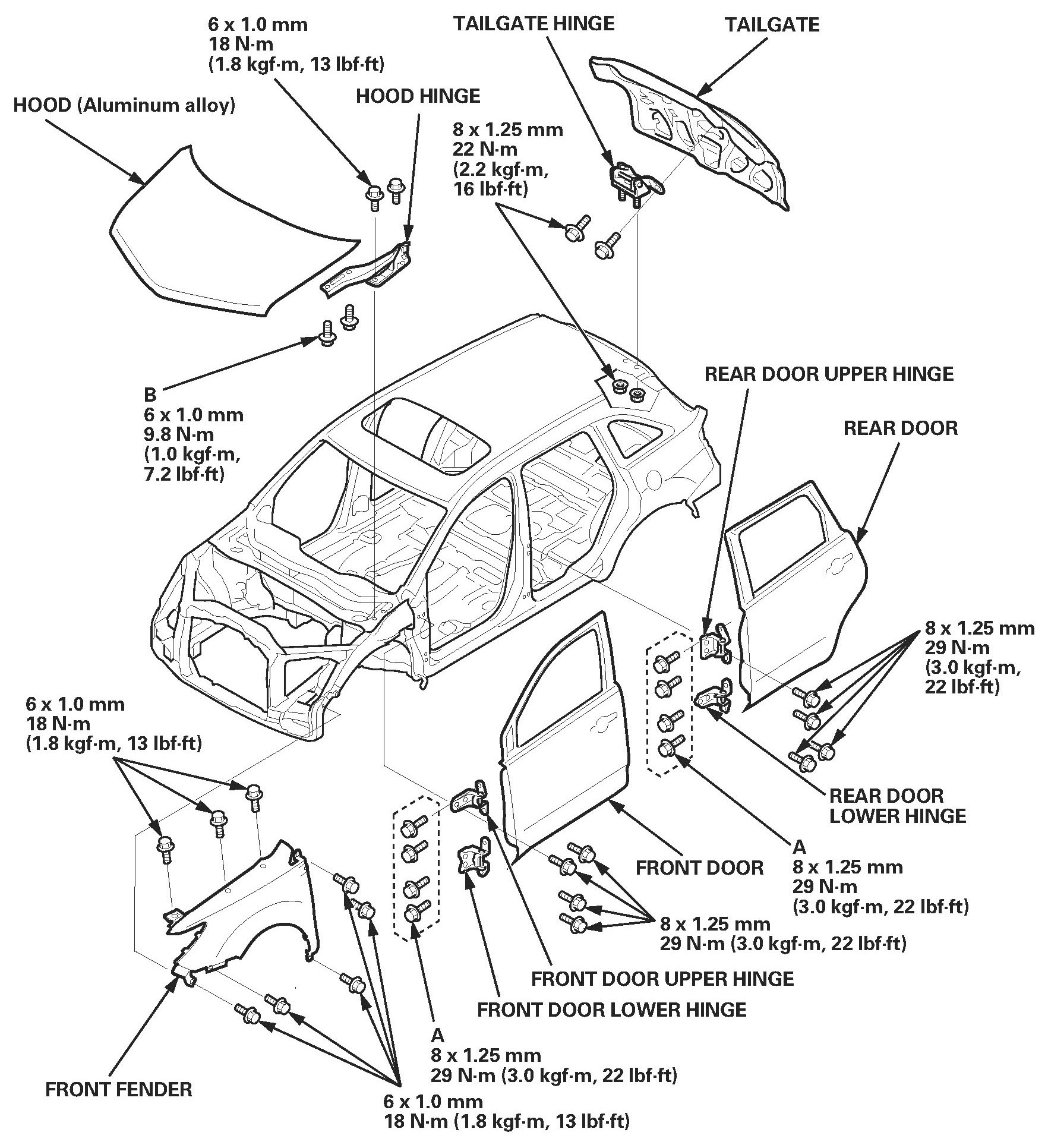 - The hood mounting bolts (B) are special corrosion-resistant bolts. Before installing the hood, replace the mounting bolts with new ones.