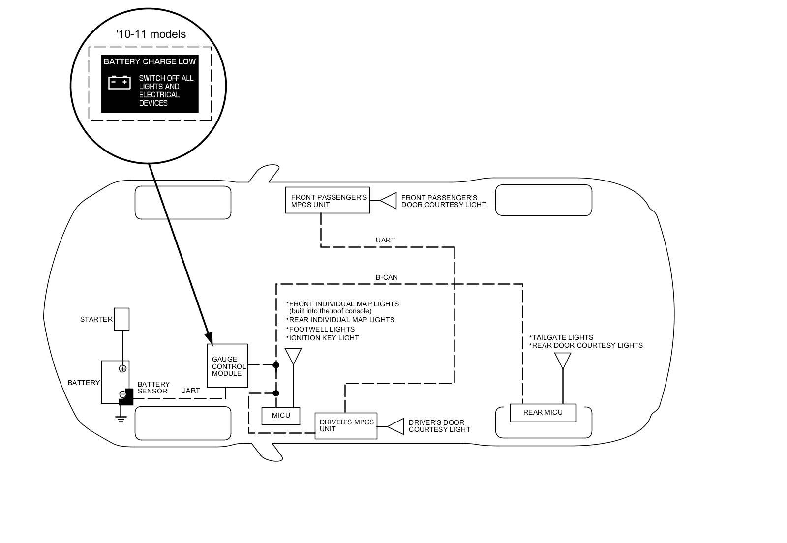 When the battery sensor detects the battery voltage decreasing, that information is sent to the gauge control module via the UART line. The gauge control module then operates a beeper, and displays the message "SWITCH OFF ALL LIGHTS AND ELECTRICAL DEVICES" on the multi-information display (MID) to inform the client that electrical devices should be turned off. If electrical devices are not turned off and the battery voltage decreases more, the gauge control module sends an interior lights off signal to the MICU, the rear MICU, and/or the driver's MPCS unit via the B-CAN line (the front passenger's MPCS unit receives that signal from the driver's MPCS unit via the UART line). Based on that signal, the units cut off the ground circuits of the interior lights and turns them off.