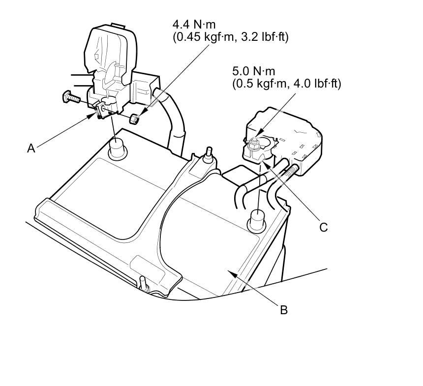 3. Reconnect the positive cable (A) to the battery (B) first, then reconnect the negative cable (C) to the battery.