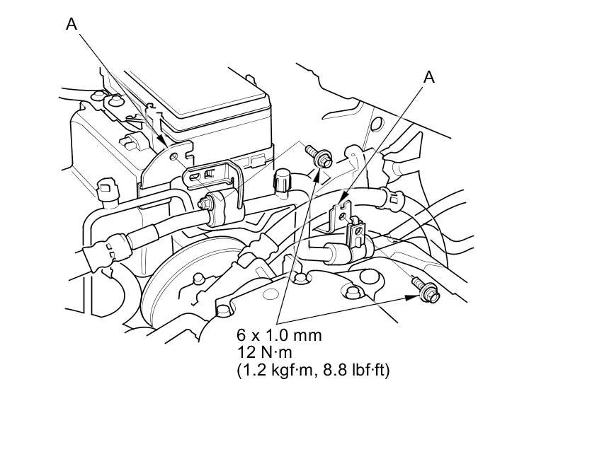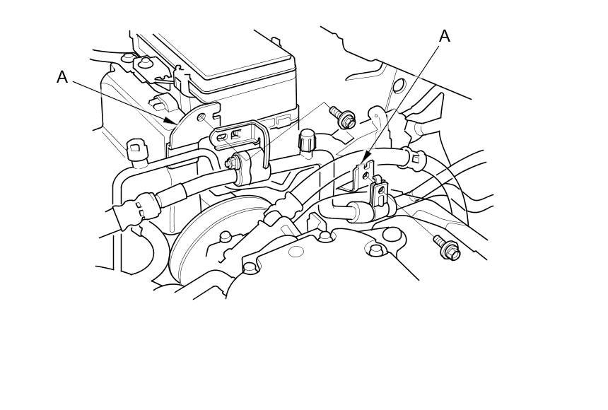 6. Remove the harness holder (A), then disconnect the A/C compressor clutch connector (B).