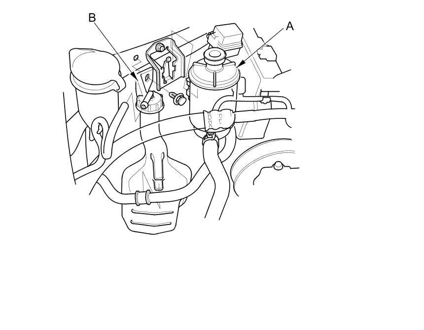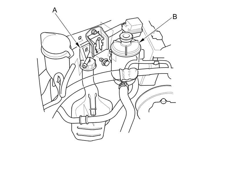 5. Remove the coolant reservoir (A), then remove power steering fluid reservoir (B) from the bracket.