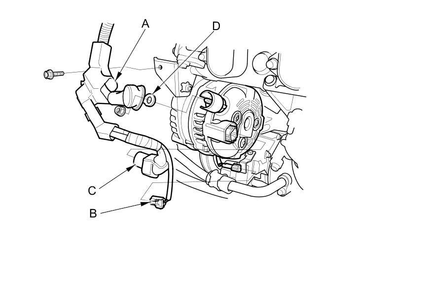 7. Disconnect the alternator connector (C) and the positive alternator cable (D) from the alternator.