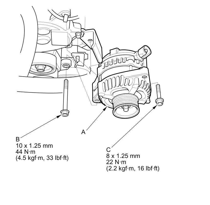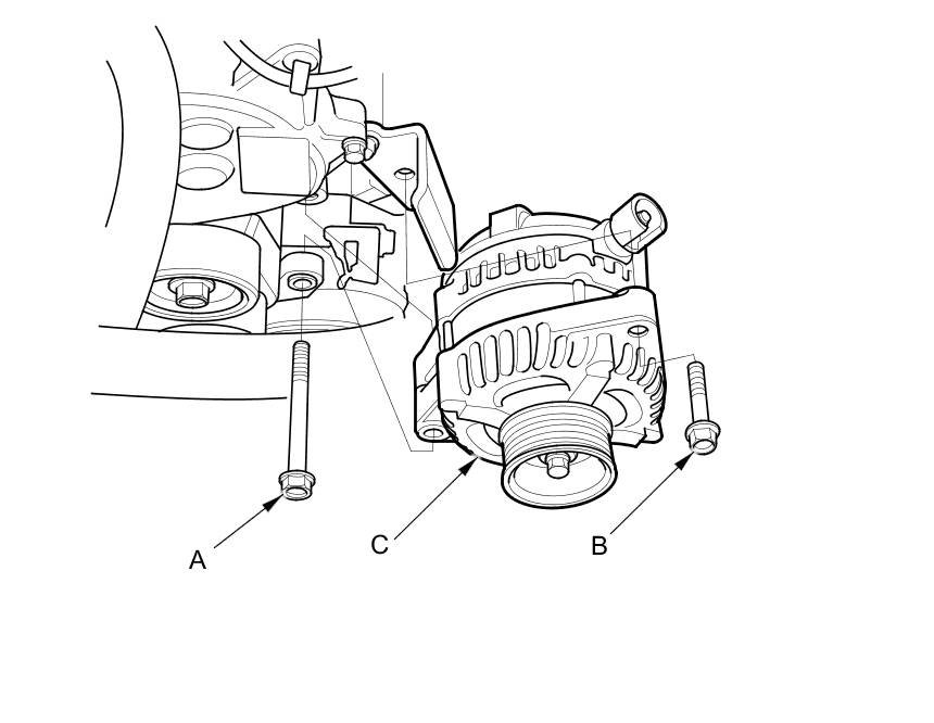 8. Remove the mounting bolt (A) and alternator bracket mounting bolt (B), then remove the alternator (C).