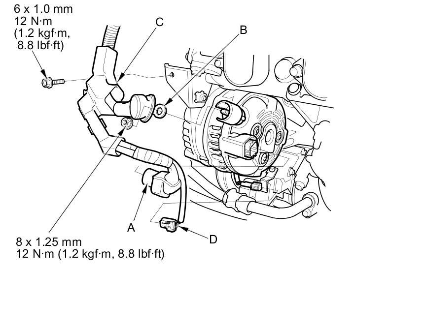 3. Install the harness holder (C), then connect the A/C compressor clutch connector (D).