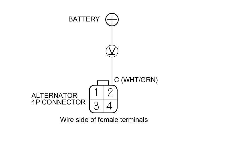 7. Measure the voltage between alternator 4P connector terminal No. 2 and the positive terminal of the battery.