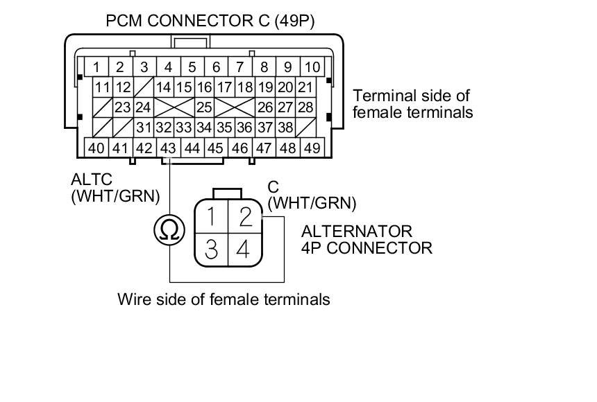 13. Check for loose terminals and connections, then check for continuity between PCM connector terminal C43 and alternator 4P connector terminal No. 2.