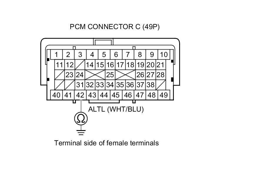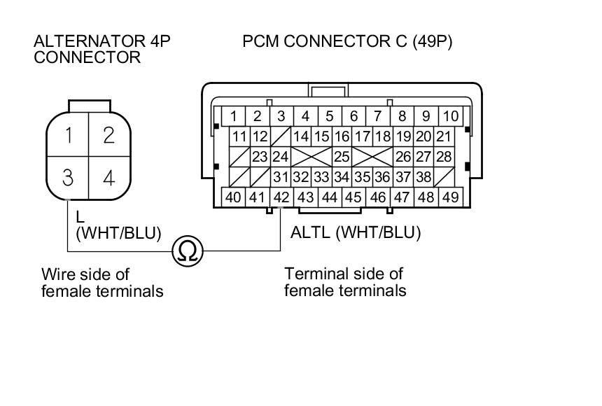 25. Check for continuity between PCM connector terminal C42 and alternator 4P connector terminal No. 3.