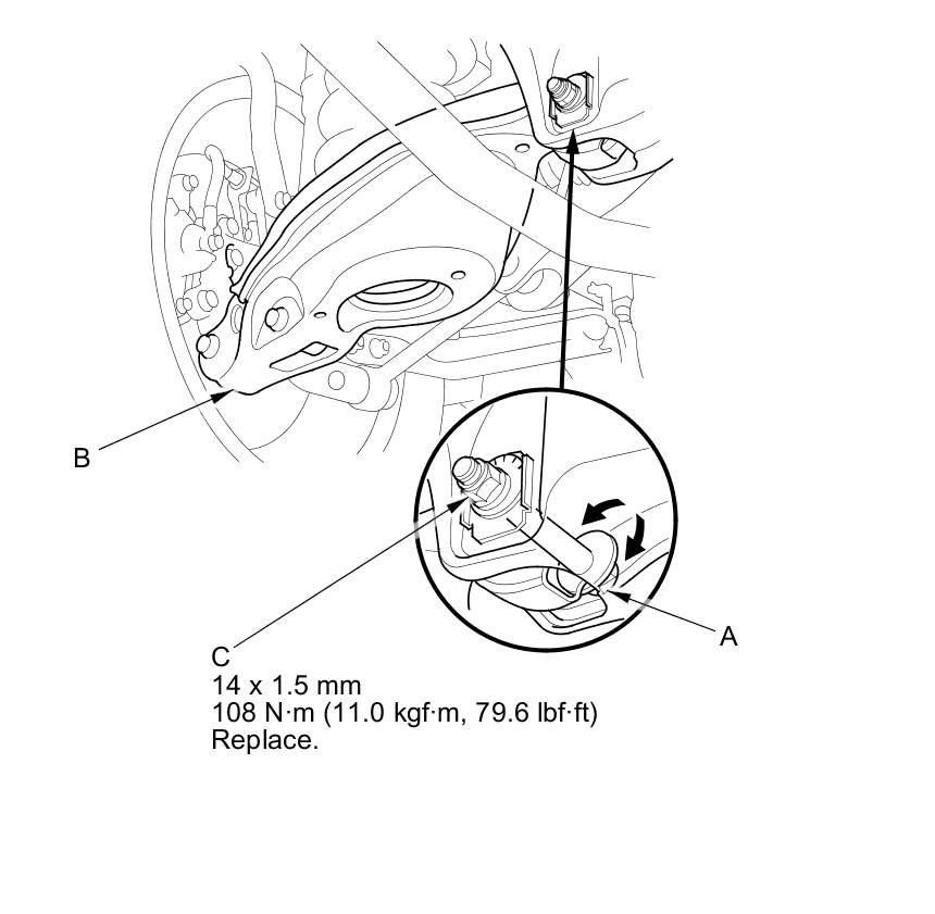 3. Hold the adjusting bolt (A) on the lower arm B, and remove the self-locking nut (C).