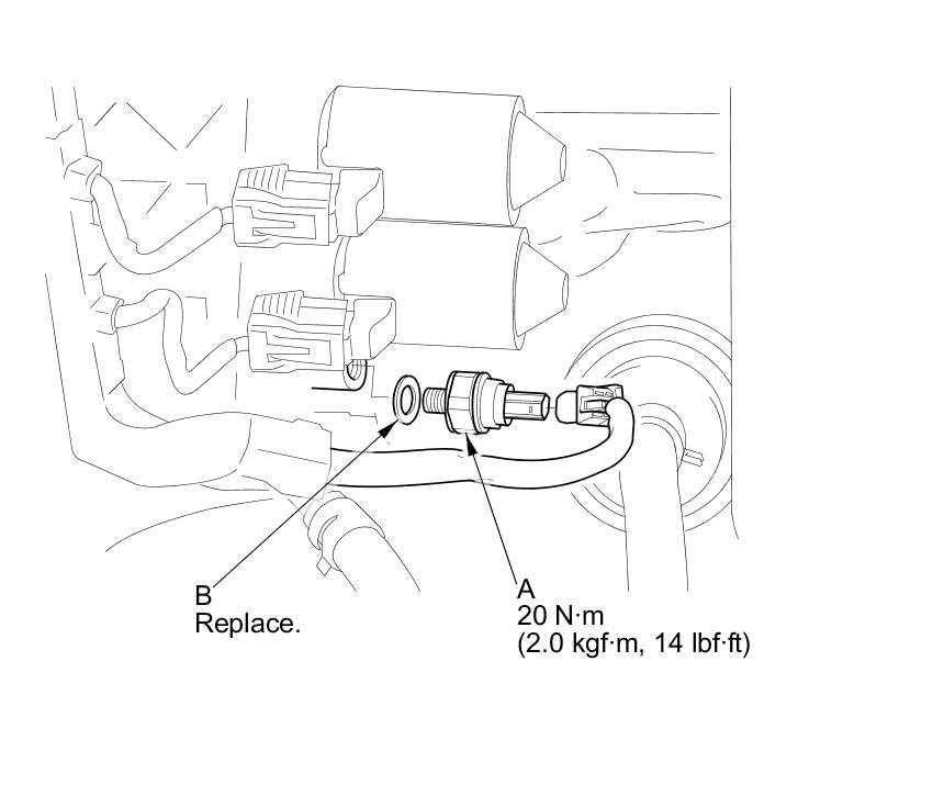 5. Disconnect the line pressure switch connector, and remove the line pressure switch (A) and the sealing washer (B).