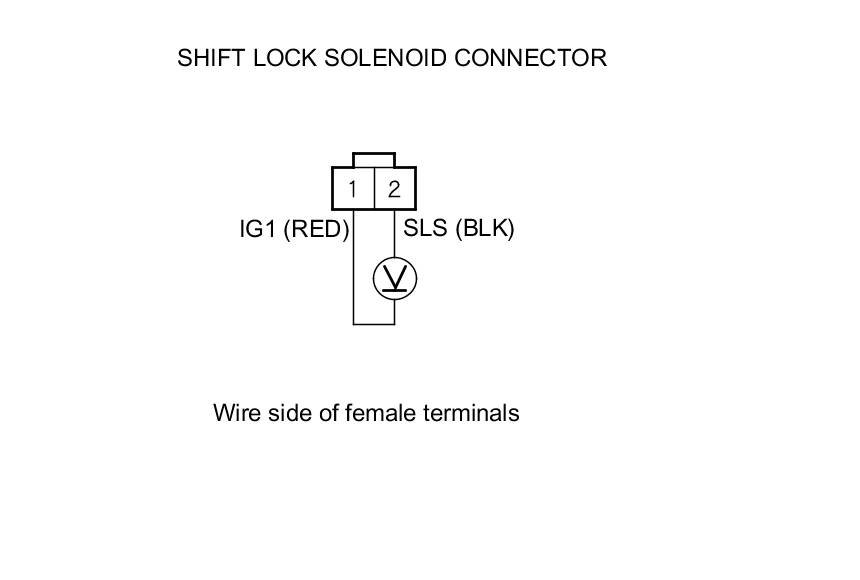 11. Release the brake pedal, and measure the voltage between shift lock solenoid connector terminals No. 1 and No. 2. The shift lever must be in P.