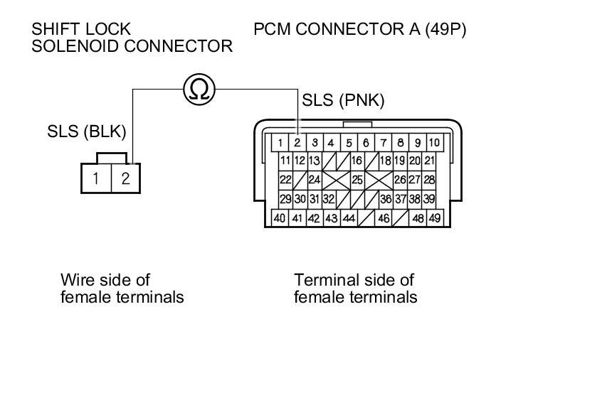 15. Check for continuity between PCM connector terminal A2 and shift lock solenoid connector terminal No. 2.