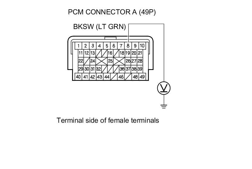 20. Measure the voltage between PCM connector terminal A8 and body ground while pressing the brake pedal and when the brake pedal is released.