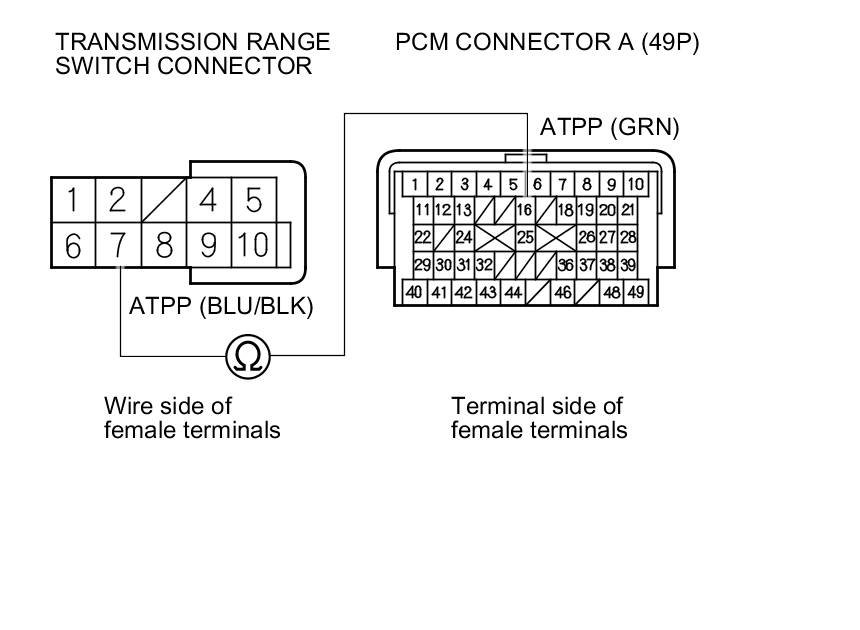 30. Check for continuity between PCM connector terminal A16 and the transmission range switch connector terminal No. 7.
