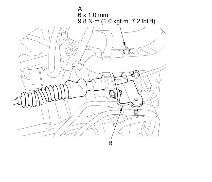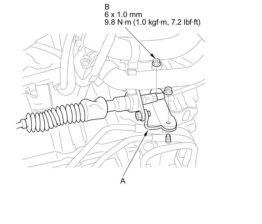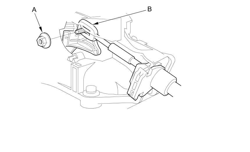 13. Remove the nuts (A) securing the shift cable bracket (B).