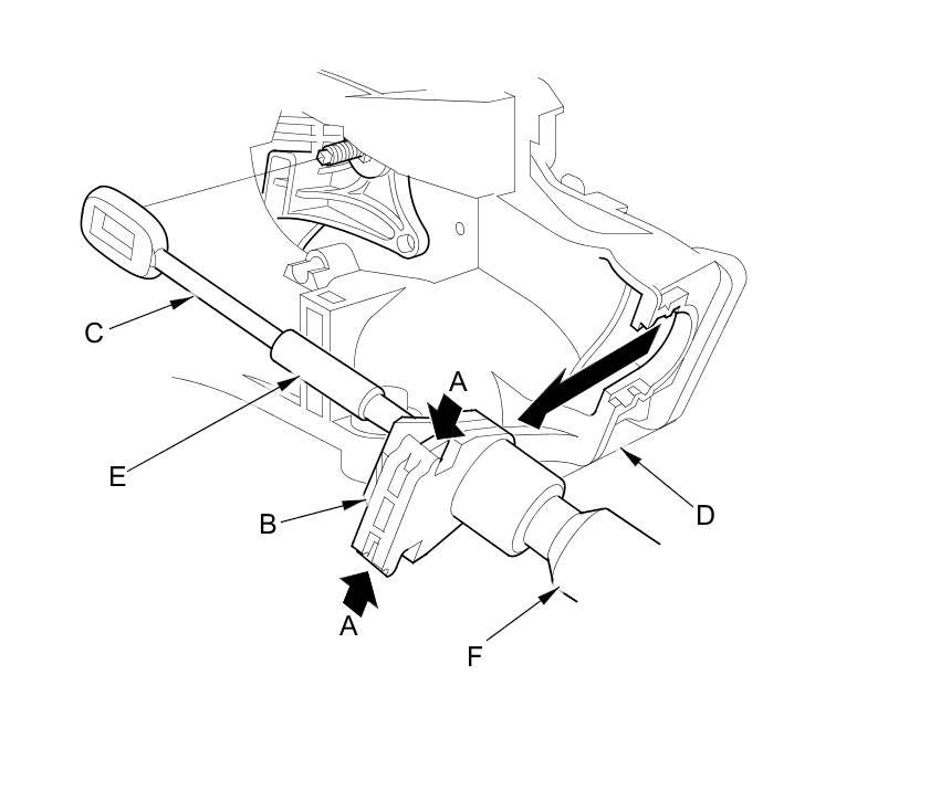 6. Press the holder lock release (A), and pull out the socket holder (B) to remove the shift cable (C) from the shift lever bracket base (D). Do not remove the shift cable by pulling the shift cable guide (E) and the damper (F).