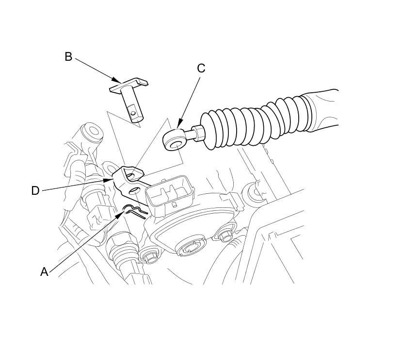 12. Remove the spring clip (A) and the control pin (B), then separate the shift cable end (C) from the control lever (D).