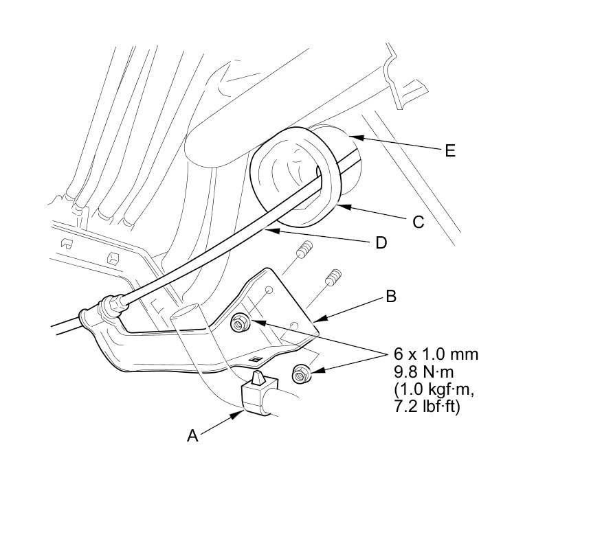 18. Insert a new shift cable through the grommet hole (E), and install the grommet in its hole. Do not bend the shift cable excessively.