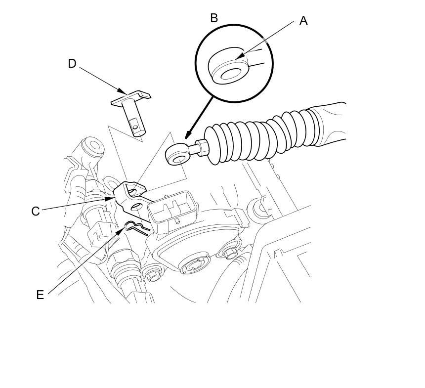 21. Apply molybdenum grease to the center of the bushing (A) on the shift cable end (B). Attach the shift cable end to the control lever (C), then insert the control pin (D) into the control lever hole through the shift cable end, and secure the control pin with the spring clip (E).
