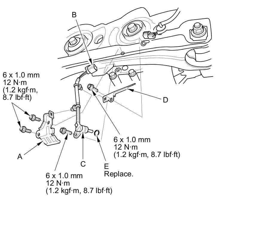 4. Install the rear differential fluid temperature sensor with a new O-ring (E) in the reverse order of removal.