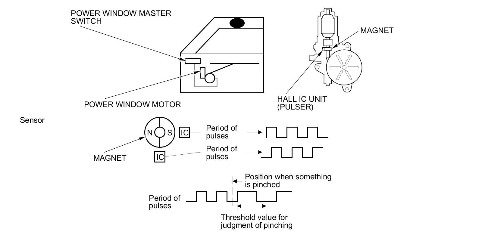 The power window motor incorporates a Hall IC unit (pulsar) which generates pulses during the motor's operation and sends pulses to the driver's and front passenger's MPCS units. As soon as the power window control unit detects a change in the pulse frequency from the Hall IC unit (pulsar), the power window control unit makes the power window motor stop and reverse. This is to prevent pinching your hand or fingers during auto-up operation.