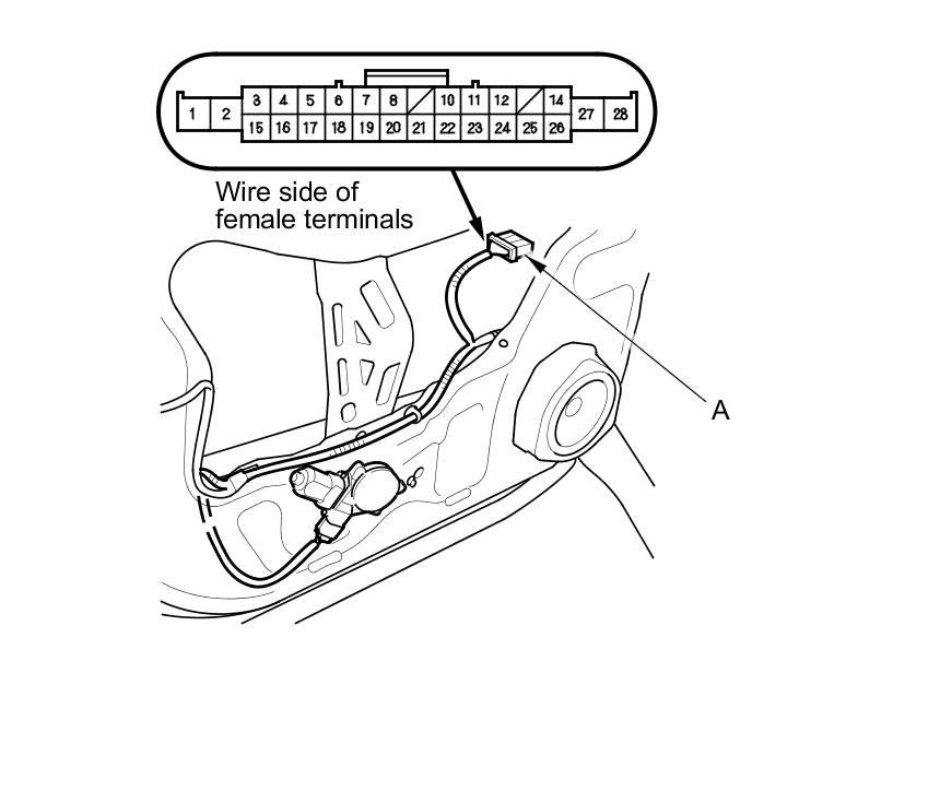 1. Remove the door panel Front Door Panel Removal/Installation, and disconnect the driver's door wire harness B 28P connector (A) from the driver's door wire harness A.
