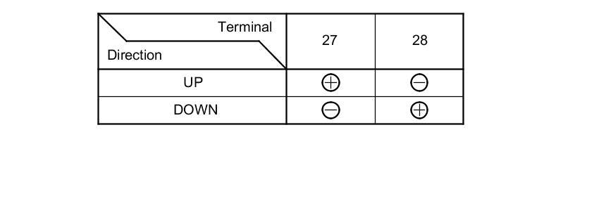 2. At the driver's door wire harness B 28P connector, test the power window motor in each direction by connecting battery power and ground according to the table. When the motor stops running, disconnect one lead immediately.