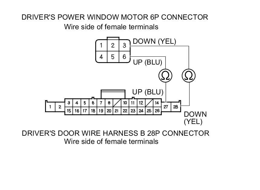5. Check for continuity between driver's power window motor 6P connector terminals No. 3 and No. 6 and the driver's door wire harness B 28P connector terminals No. 27 and No. 28 respectively. There should be continuity.