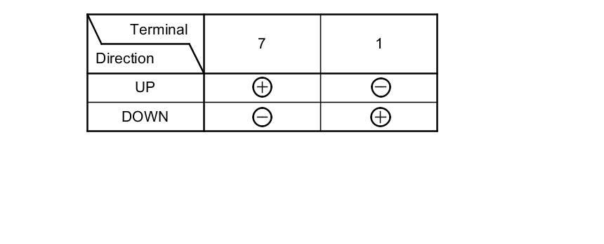 2. Test the power window motor in each direction by connecting battery power and ground according to the table. When the motor stops running, disconnect one lead immediately.
