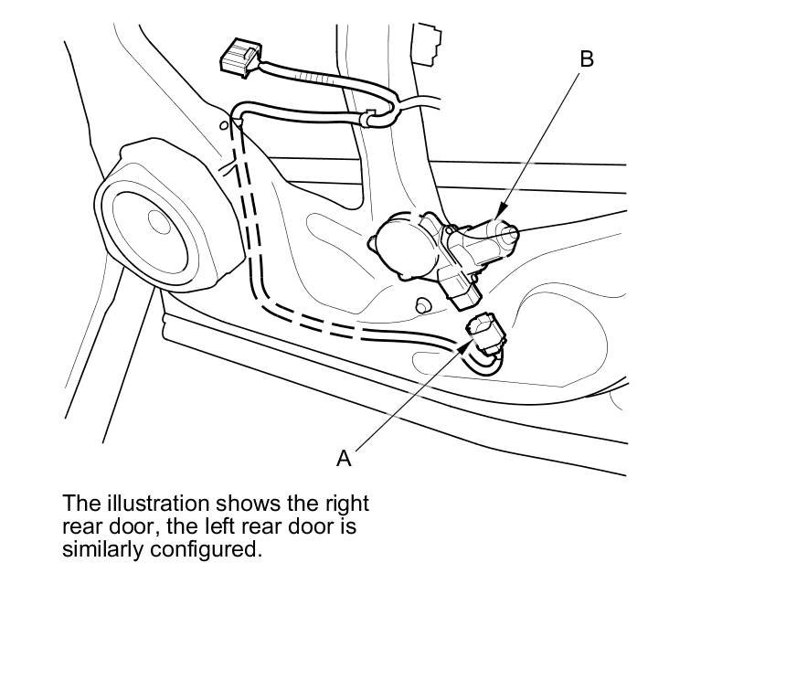 4. Disconnect the 6P connector (A) from the rear power window motor (B).