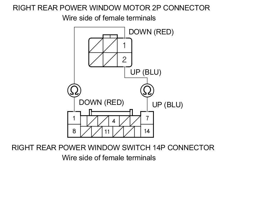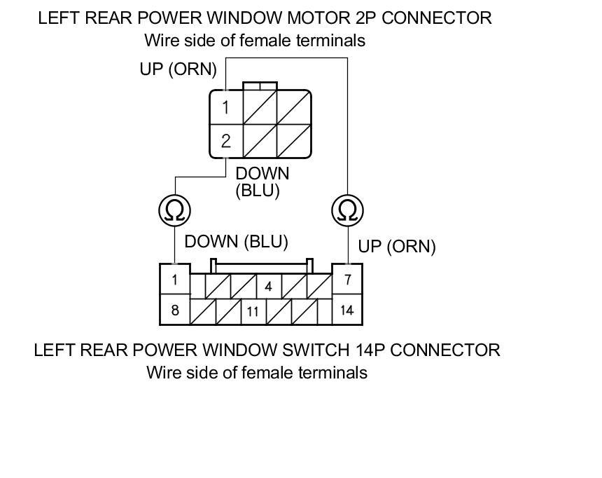 5. Check for continuity between rear power window motor 6P connector terminals No. 1 and No. 2 and rear power window switch 14P connector terminals No. 1 and No. 7 respectively. There should be continuity.