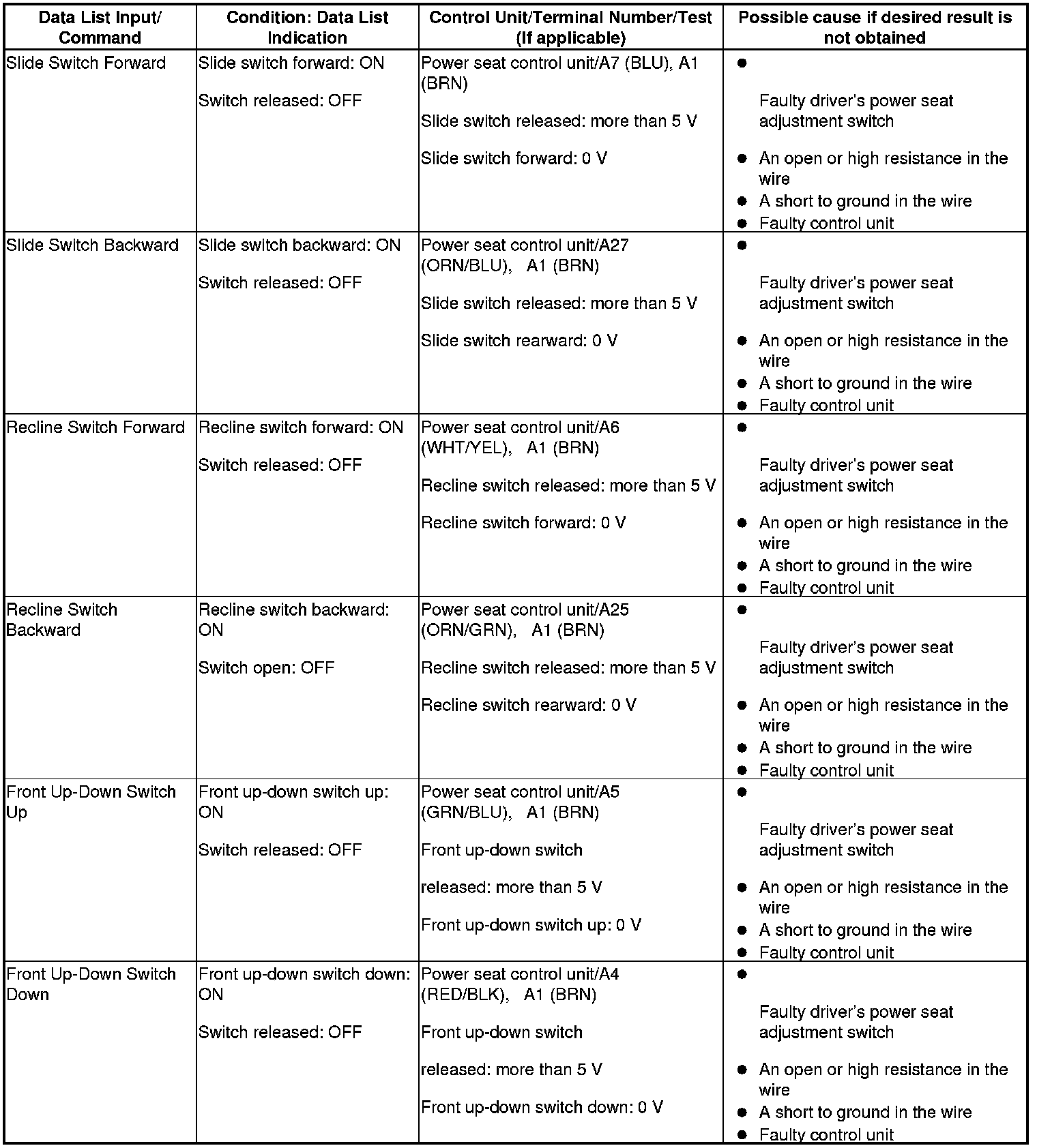 - If the data list indication is not correct, perform the appropriate test at the control unit and terminal indicated in the table.