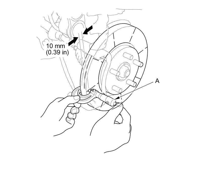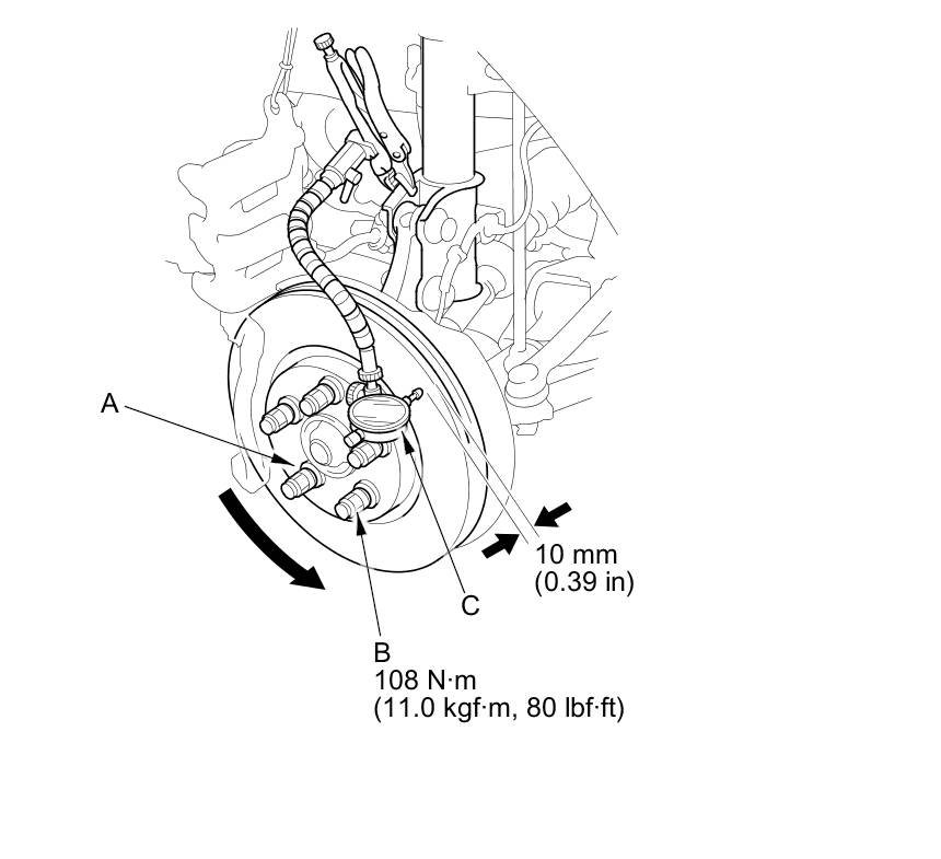 6. Set up the dial gauge (C) against the brake disc as shown, and measure the runout at 10 mm (0.39 in) from the outer edge of the brake disc.