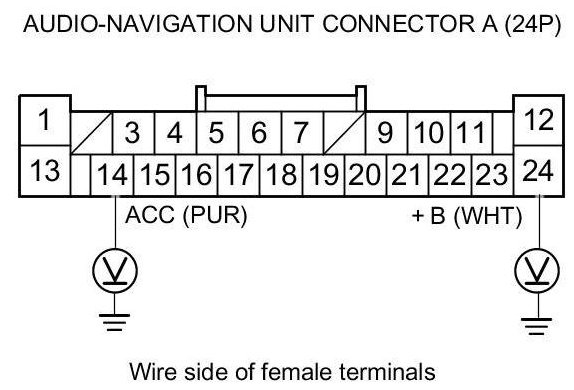 4. Measure the voltage between body ground and audio-navigation unit connector A (24P) terminals No. 14 and No. 24 individually.