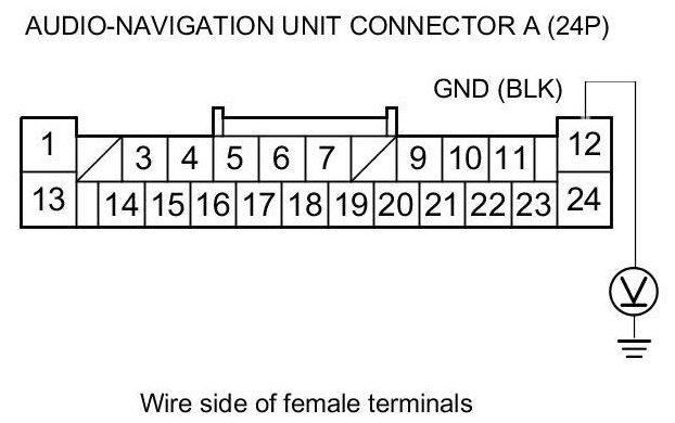5. Measure the voltage between audio-navigation unit connector A (24P) terminal No. 12 and body ground.