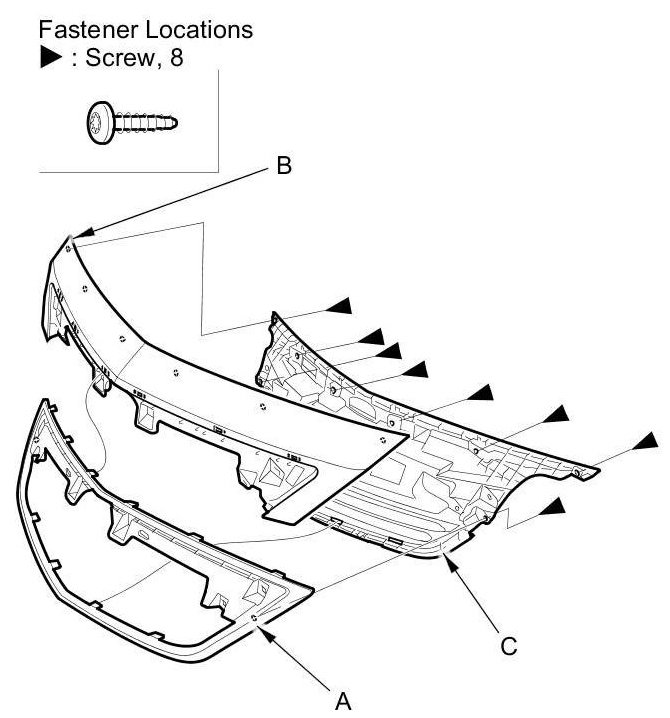 3. Remove the TORX screws, then remove the front grille molding (A) and the front grill trim (B) from the front grille base (C).
