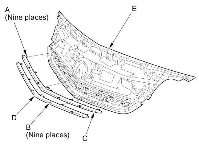 4. If necessary, release the hooks (A, B) (nine places), then remove the front grill mesh upper bar (C) and front grill mesh lower bar (D) from the front grille base (E).