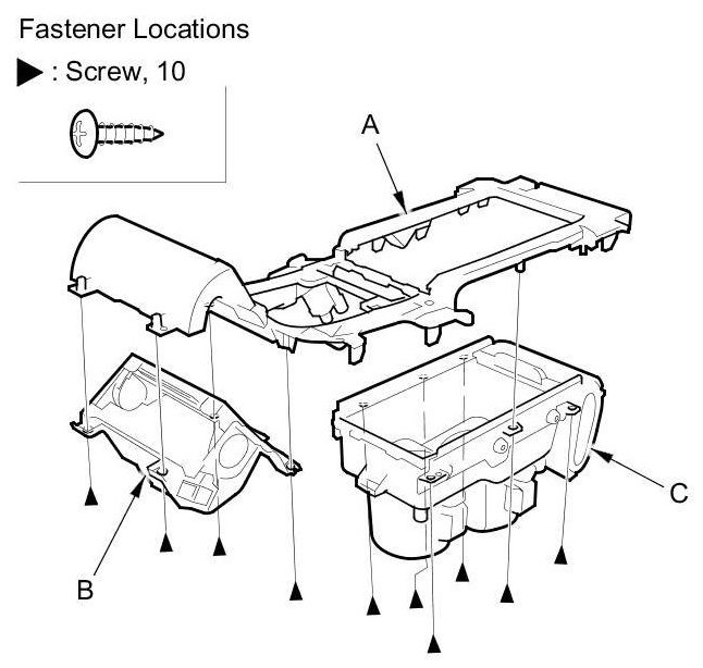 2. Remove the screws from the back or the center console panel (A), then remove the panel from the center console pocket assembly (B) and the beverage holder assembly (C).