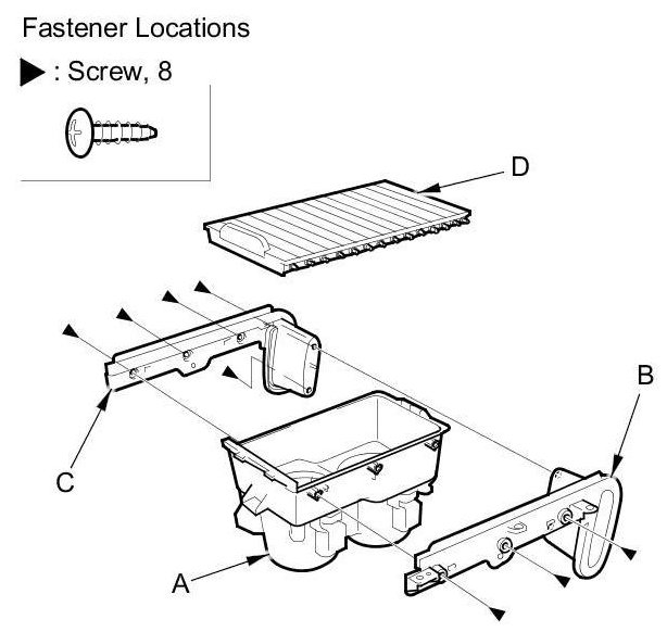 3. Remove the screws from both sides of the beverage holder (A), then remove the driver's side shutter rail (B), the passenger's side shutter rail (C), and the console shutter (D).