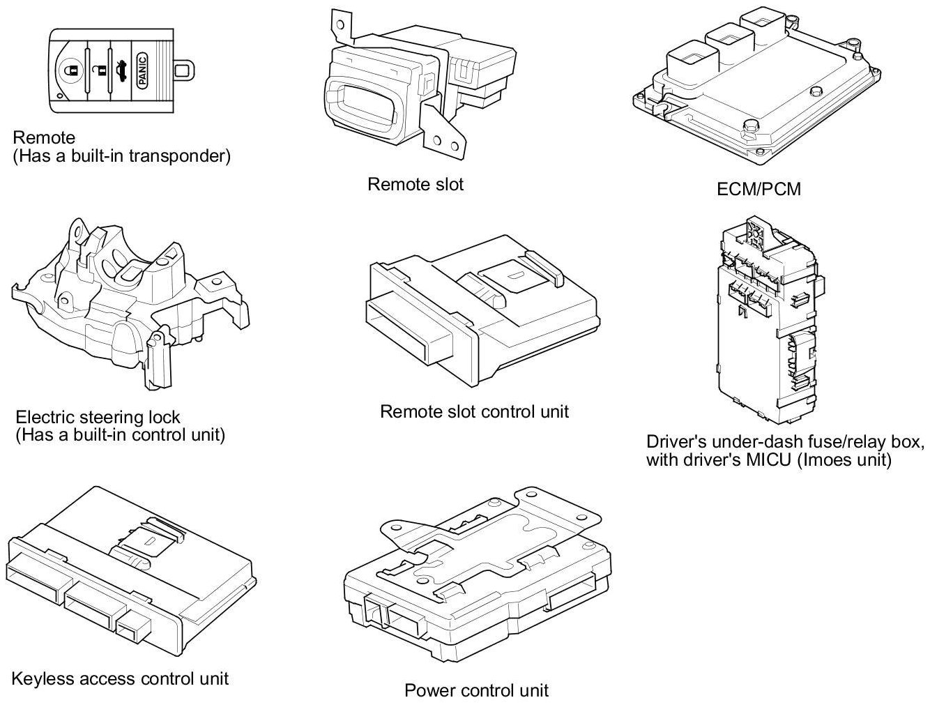 When the remote (programmed by the HDS) is inserted into the remote slot and the engine start/stop switch is pressed to select the ON mode, the remote slot control unit sends power to the transponder. The transponder then sends a coded signal back to the remote slot control unit, which then sends a coded signal to the ECM/PCM and the driver's MICU (imoes unit). The ECM/PCM and driver's MICU (imoes unit) identify this coded signal, then voltage is supplied to the fuel pump.