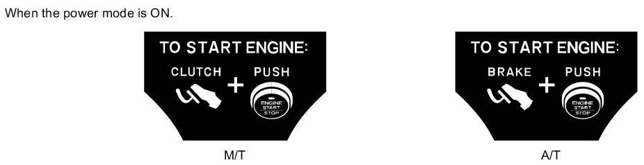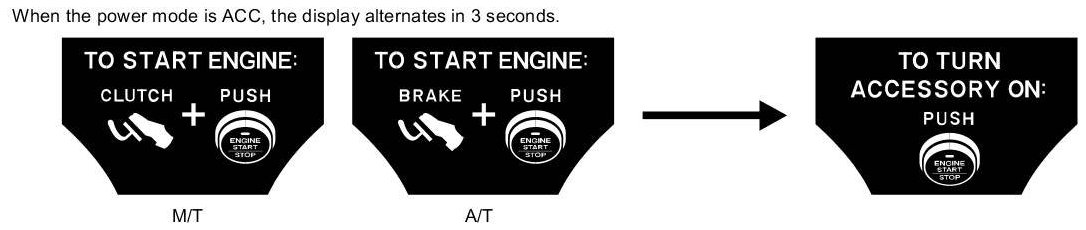 The keyless access system has four power modes: OFF, ACC, ON, and START. The power modes can be changed by pressing the engine start/stop button. The power mode changes to START mode any time the engine start/stop button is pressed while also pressing the brake pedal (A/T) or clutch pedal (M/T).