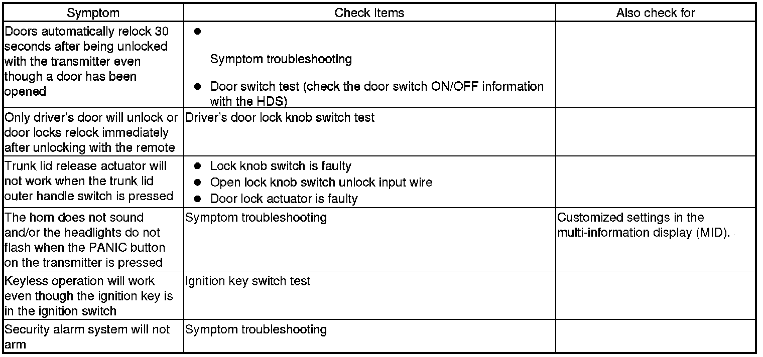 Keyless/Power Door Locks/Security System Symptom Troubleshooting Index
